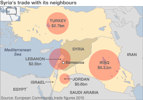 حجم التجارة السورية مع تركيا 2,7 مليار دولار, مع العراق 5,3 مليار دولار, مع الأردن 0,6 مليار دولار, مع لبنان 2,5 مليار دولار. المصدر: إحصائيات المفوضية التجارية الأوروبية لعام 2010