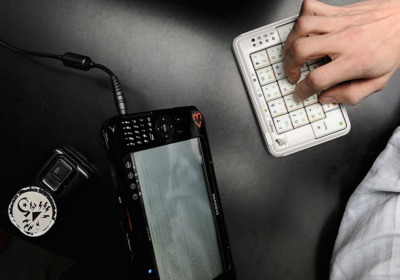 معدات النشطاء من القراصنة الالكترونيون: لوحة مفتانيح محمولة، حاسوب صغير وهاتف لينكس مع ملصق عليه شعار تيليكومكس..