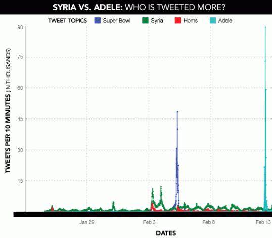 حكاية جديدة: سوريا لا تعدو كونها الحلقة الأخيرة لسلسة من ثورات التويتر. خلال احتجاجات إيران عام 2009 كان الإعلام الافتراضي شاهداً على تجربة مماثلة في تغطية الأخبار من وجهة نظر المواطنين في دولة مغلقة وللمرة الأولى. شاهد العالم, مشدوهاً, موت المتظاهرة ندى آغا سلطان المسجل في فيديو. اليوم, أصبح هذا النوع من الصور الفظيعة شائعاً لدرجة مقلقة. الثورة السورية تنقل لنا بشكل حي ومباشر سلسلة متواصلة من الصور المخيفة. والسؤال الذي يطرح نفسه الآن, هل يريد الناس مشاهدة ذلك بدل الحديث عن المغنية آديل Adele أو مناقشة نهائي كرة القدم الأميركية, السوبر بول؟