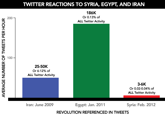 هناك, بالطبع, من يغرد عن سوريا, ولكن دائرة الاهتمام تبدو محصورة في بعض الناشطين أو المهتمين بشؤون الشرق الأوسط. لم يهتم جمهور شبكات التواصل الاجتماعي بالموضوع كما كانت الحال في إيران ومصر. كما نلاحظ في المخطط أدناه, فقد كان حجم التغريدات المتعلقة بسوريا (كنسبة من التغريدات الكلية) أقل بكثير من تلك المتعلقة بمصر وإيران خلال انتفاضتيهما. التقديرات هنا مبنية على عدة مصادر من المواقع الالكترونية التي تقوم بتغطية التغريدات للأحداث المختلفة (مثل Twitter’s blog, Customer Insight Group, Mashable, the Sysomos blog, Twapperkeeper). هذه التقديرات ليست دقيقة مائة بالمائة، ولكنها تقدر بشكل مقبول حجم الانشغال على التويتر بهذه الأحداث.
