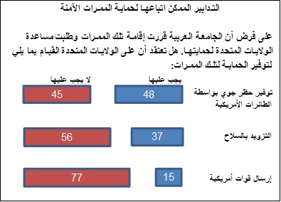طلب من المشاركين في الاستطلاع أن يفترضوا أن جامعة الدول العربية قررت إنشاء ممرات آمنة، وأنها طلبت مساعدة الولايات المتحدة في حمايتها. ثم سُئلوا بعد ذلك عن ثلاثة أشكال مختلفة من المساعدات العسكرية: تقديم حماية جوية بواسطة الطائرات الأميركية، أو توفير الأسلحة، أو إرسال قوات أميركية. وكما ذُكر أعلاه، فقد استحسنت أغلبية محدودة من الجمهوريين والديمقراطيين الفكرة – 54% في كلتا الحالتين – إلا أن عدداً معتبراً من المستقلين عارض الأمر، 47% إلى 34%. وبالتالي فإن ما يقارب من نصف الأميركيين (48%) يرون أن على الولايات المتحدة أن تكون مستعدة لتأمين حماية جوية، لكن ما يكاد يناهزهم عدداً يرى عكس ذلك (45%).