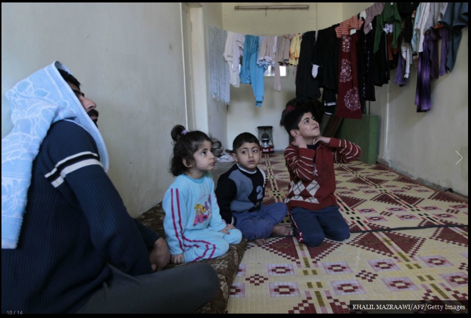 عائلة سورية لاجئة تجلس في قاعة دافئة في مخيم تم إنشاؤه جزئياً في مدينة المفرق في 20 فبراير/شباط 2012، بالقرب من الحدود الشمالية الأردنية مع سوريا.