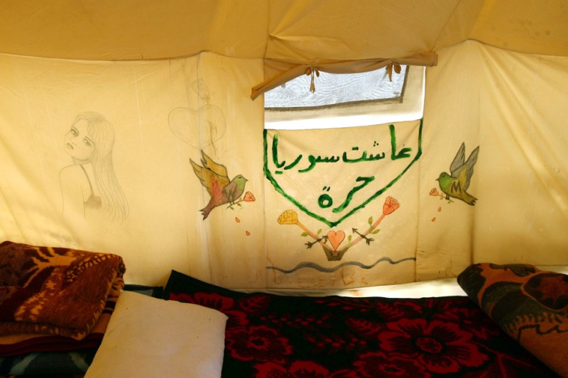 23- نشاهد أعمالاً فنية على جدار خيمة في مخيم الهلال الأحمر للاجئين السوريين في قرية Boynuyogun في مقاطعة Hatay يوم 25 آذار/مارس. يضم مخيم Boynuyogun حوالي 2000 لاجئ سوري يعيشون في 600 خيمة كانوا قد هربوا من الاضطرابات التي استمرت لأكثر من عام، ويقول مسؤولون إن العدد الإجمالي للفارين من سوريا قد تجاوز 17,000 بقليل. (آدم ألتان Adem Altan / AFP).