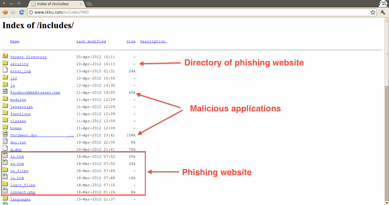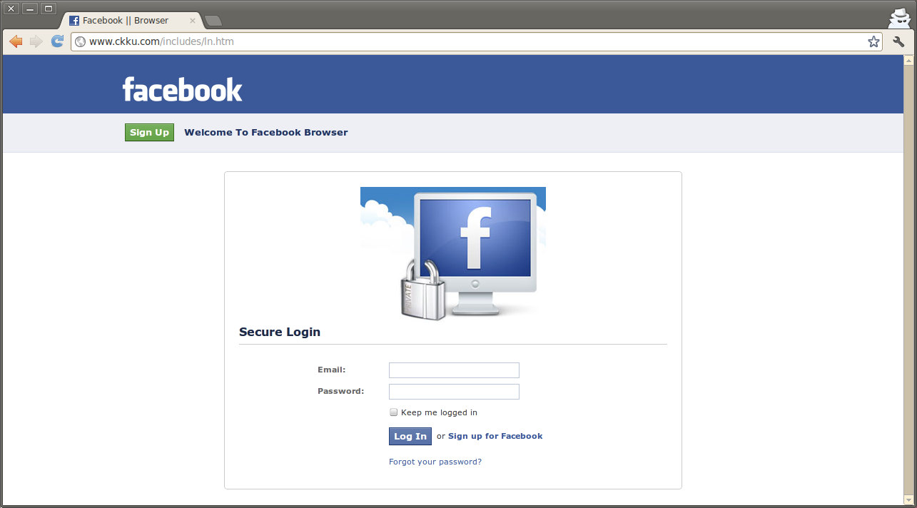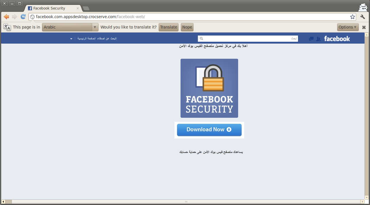 وقد استضيف هذا التطبيق الوهمي لأمن الفيسبوك بواسطة نطاق مثير الشبهة http://www.ckku.com))، صفحة الفهرس تظهر موقعاً مشروعاً مختصاً في بيع المجوهرات على شبكة الإنترنت ولكن الملاحظ أن هذا النطاق قد عرض محتويات تضر بأجهزة الكومبيوتر منذ 18 مارس 2012، الصورة التالية توضح ذلك.