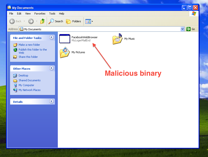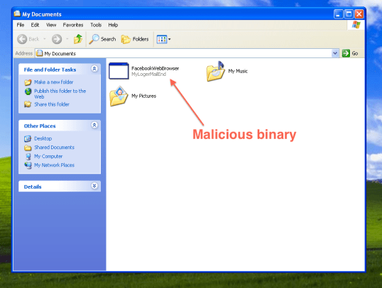 يبدو الموقع وكأنه يقدم تطبيقاً خاصاً بأمن الفيسبوك، عند تنزيل التطبيق فإنه يقدم لك ملفاً يسمى بـ FacebookWebBrowser.exe كما هو موضح في الصورة أعلاه، هو تطبيق يضر بالمستهدف عن طريق تسجيل البيانات المدخلة عن طريق لوحة المفاتيح وبالتالي سرقة معلومات الدخول لحسابات البريد الإلكتروني، يوتيوب، الفيسبوك، سكايب، وغيرها، في هذا الوقت أكدت الشركات الست المختصة في مكافحة الفيروسات بأن هذا التطبيق يضر جهاز الكومبيوتر، يمكن رؤيته في الصورة الموجودة أدناه.