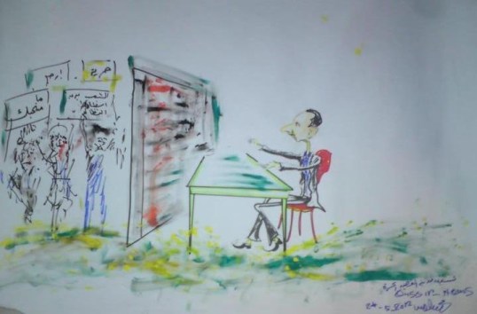 His work portrait the revolution going on in the streets and the political events in the form of caricatures. For example one of his latest cartoons (below) contrasts the 2012 presidential debate in France and the way which Bashar Assad came to power. “Sarkozy was debating a competing contender and presidential candidate Hollande. The debate was calm and democratic. The debate was in France and Hollande won. This arose our emotions as Syrians and made us ponder on how democracy was practised in Syria. Bashar al Assad was debating a wall when he came to power. He had discussions with the wall. He debated the wall! There wasn’t any debate, there wasn’t any other candidate competing for the presidency”.