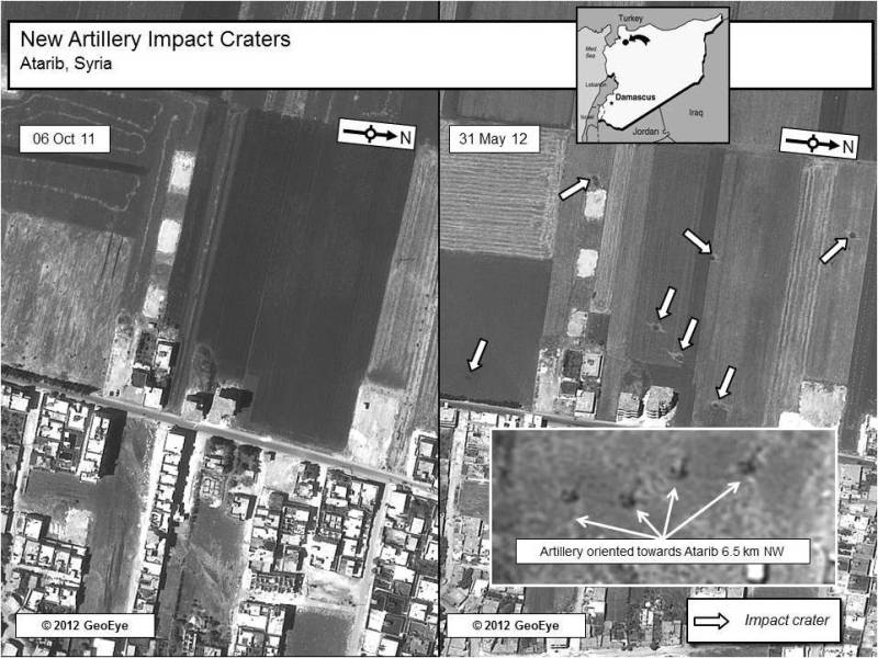 صورة فضائية بتاريخ 31/5/2012 لبلدة الأتارب في سوريا، تظهر البلدة بتاريخ 6/10/2011، ومن ثم آثار القصف الذي خلفته المدفعية في الصورة الثانية الملتقطة بتاريخ 31/05/2012.
