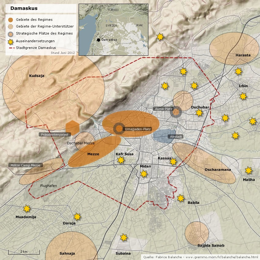 ترزح منطقة الميدان في قلب العاصمة السورية تحت رقابة مشددة من قبل النظام. فالمكان الذي كان سابقاً مشهوراً بأفضل الحلويات أصبح اليوم يعتبر حاضنةً للانتفاضة. فمع المناوشات اليومية بالكاد يجرؤ السكان على الخروج إلى الشارع. إنها أشبه بزيارة لمدينة الأشباح.
