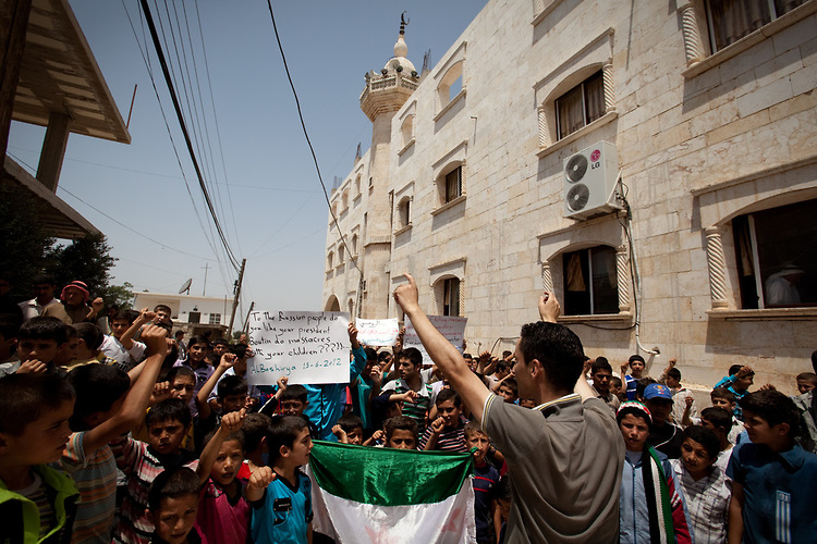 تنظم الاحتجاجات المناهضة للحكومة أسبوعياً في جميع أنحاء سوريا يوم الجمعة بعد صلاة الظهر. وتضم المظاهرات عادة قطاعاً عريضاً من القرويين، من ضمنهم العديد من الأطفال. بدأت الاحتجاجات السلمية في مارس/آذار 2011 واستمرت طوال الانتفاضة، على الرغم من تعرض أعداد كبيرة من الناس للقنص، لمجرد التظاهر. البشيرية، إدلب، سوريا.