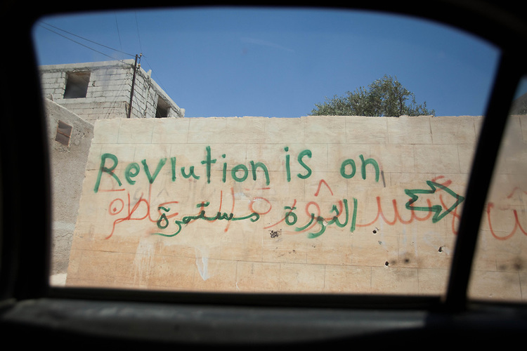 كتابة على جدار في بلدة سرمين في إدلب تقول: “الثورة مستمرة”. إن محافظة إدلب في شمال غرب سوريا إحدى المناطق القليلة في سوريا الواقعة حالياً تحت سيطرة الجيش السوري الحر، على الرغم من أن هذه السيطرة غير مكتملة ومتحولة دوماً. سرمين، إدلب، سوريا.