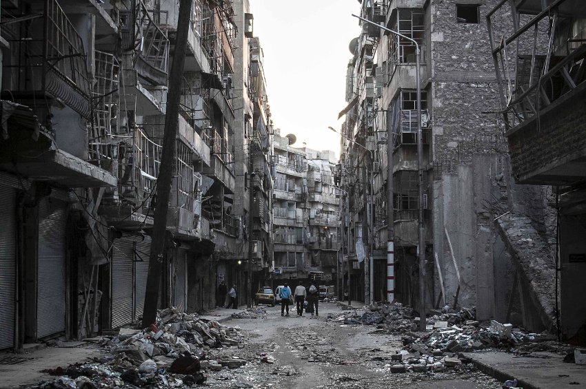 In this Saturday, Oct. 27, 2012 photo, Syrian residents walk on a street among the debris of buildings damaged by heavy shelling in the southeast of Aleppo City. (AP Photo/Narciso Contreras).