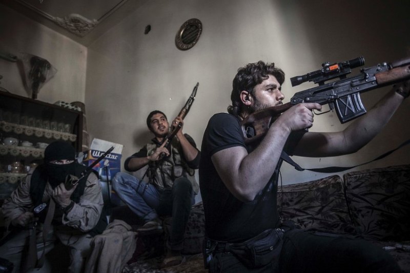In this Monday, Oct. 29, 2012 photo, a rebel sniper aims at Syrian army positions in the Aleppo Jedida district, Syria. Syrian fighter jets pounded rebel areas across the country on Monday with scores of airstrikes that anti-regime activists called the most widespread bombing in a single day since Syria’s troubles started 19 months ago. (AP Photo/Narciso Contreras).