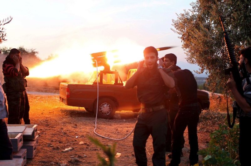 Free Syrian Army fighters fire a rocket towards a castle where pro-government forces are based, in Haram town, Idlib Governorate