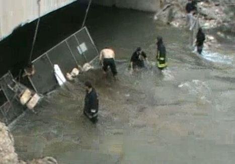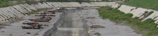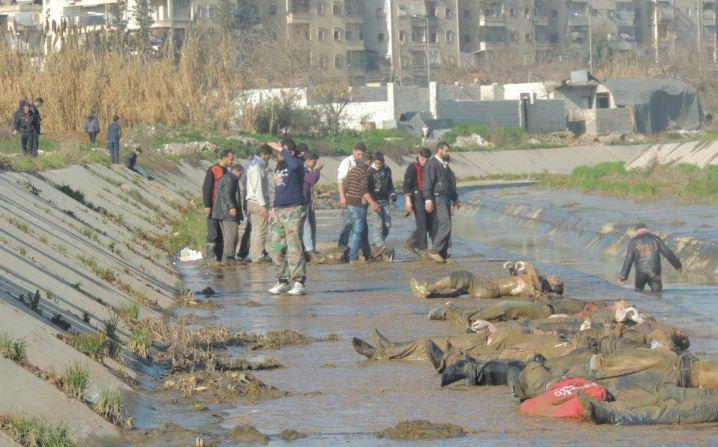 The inhabitants of the area and the Free Syrian Army Brigades gathered and started recovering the bodies from the river. Some people installed a grid at the river to stop the bodies drifting away by the current, as shown in the video below: