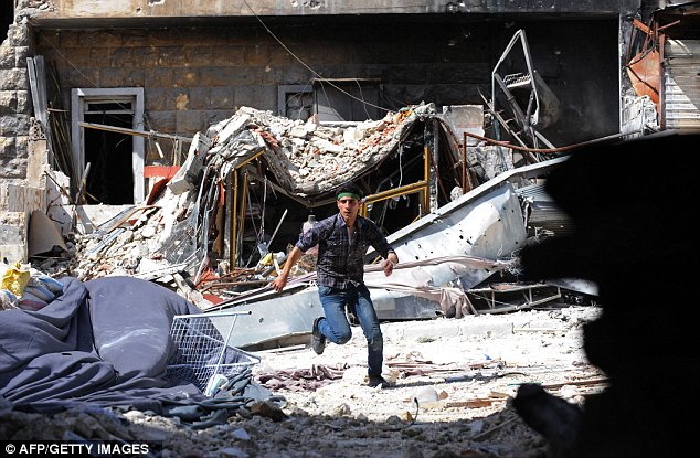 الصراع: مقاتل من المعارضة يركض للاحتماء من نيران قناصة الجيش السوري (النظامي) خلال الاشتباكات في مدينة حلب الشمالية.