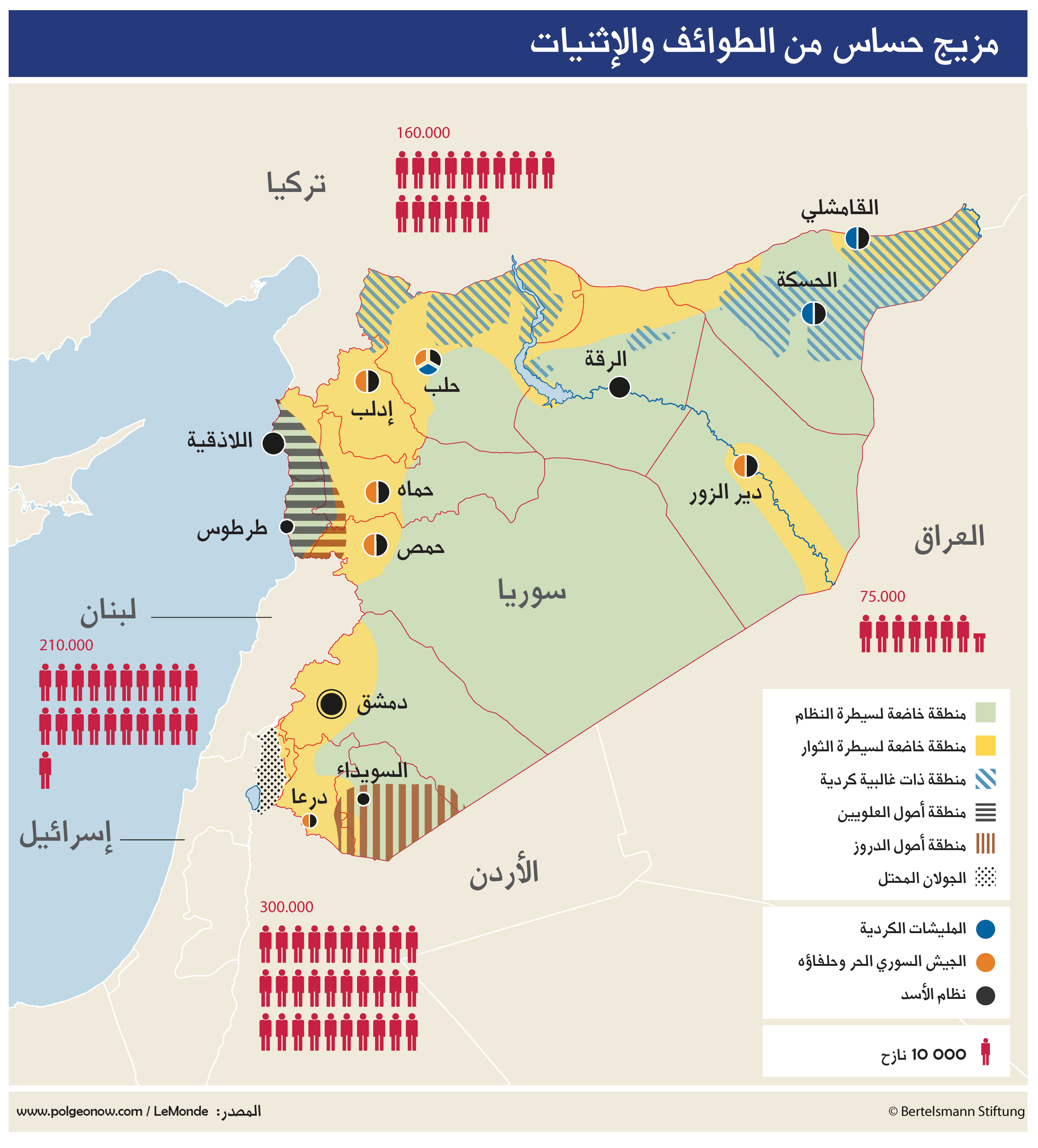 أغلب العلويين يقطنون منطقة الساحل، بينما يتمركز الدروز في الجنوب والأكراد في الشمال الشرقي على الحدود مع العراق وتركيا. وبغض النظر عن مراكز التجمع تلك، فإن جميع الطوائف والقوميات تعيش منسجمة جنباً إلى جنب. وبسبب التركيبة الحساسة المتمثلة بوجود أغلبية سنية ولكن، وفي نفس الوقت، بسيطرة علوية على مراكز الحكم والسياسة، فإن خطر إثارة نزاعات طائفية عصبية، يبقى خطراً قائماً. لقد سلب النظام السوري الطائفةَ العلويةَ التي يتنمي إليها هويتها الدينية، وحولها إلى طائفة متواطئة مع الدكتاتورية. أما طبقة التجار السنة في دمشق وحلب فترتبط بالنظام من خلال الفساد والمحسوبيات. وينطبق الأمر ذاته على رجال الأعمال المسيحيين أيضاً.
