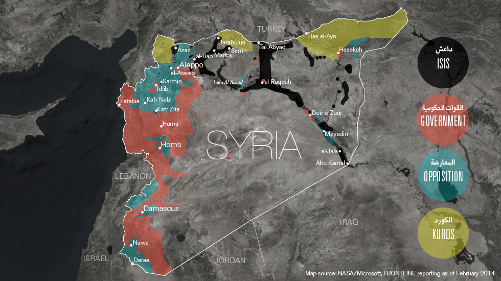في برنامج (فرونت لاين Frontline, PBS) التلفزيوني وضع إيفان ويكسلر Evan Wexler وسارة تشيلدريس Sarah Childress هذه الخريطة التي تظهر المجموعات الأربعة الرئيسة التي تسيطر على المناطق السورية، وذلك في فقرة جديدة من البرنامج امتدت لساعة من الزمن وتحدثت عن القتال هناك.