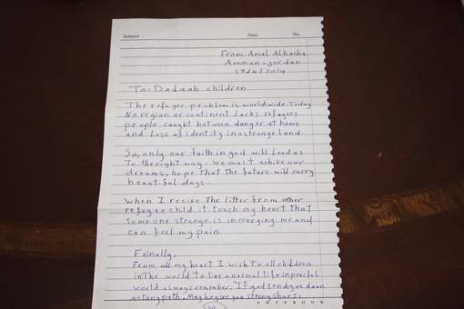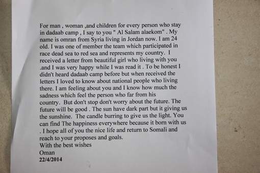 مستقبل أفضل. أغلبية الأطفال تحدثوا في رسائلهم عن غدٍ أفضل. هذا لن يتحقق بالتمني فقط : ” إذهب إلى المدرسة ” كتب محمد وأكمل قائلاً ” عندها تستطيع أن تساهم في إعادة بناء وطنك في المستقبل” ” أخوتي وأخواتي الأعزاء, ثابروا في دراستكم ” ينصح محمد ضاهر أقرانه السوريين ويقول ” تألق فقد تكون انت الرئيس القادم لسوريا “. وقد تلقى الأطفال السوريون رسائل أقرانهم الصوماليون وأرسلوا بدورهم رسائل أيضاً. تقول أمل الباشا وهي طفلة سورية لاجئة ” عندما تلقيت رسالة من طفل لاجئ أيضاً لامست قلبي ومشاعري, أن شخصاً غريباً يشجعني ويشعر بمعاناتي”. ” بصراحة لم أسمع بمخيم داداب من قبل ” كتب عمران يقول ” أشعر بمعاناتكم وأفهم الأن جيداً معنى ان لا تستطيع الذهاب إلى بلادك… أتمنى لكم حياة مشرقة وأن تستطيعوا العودة إلى وطنكم الصومال”.